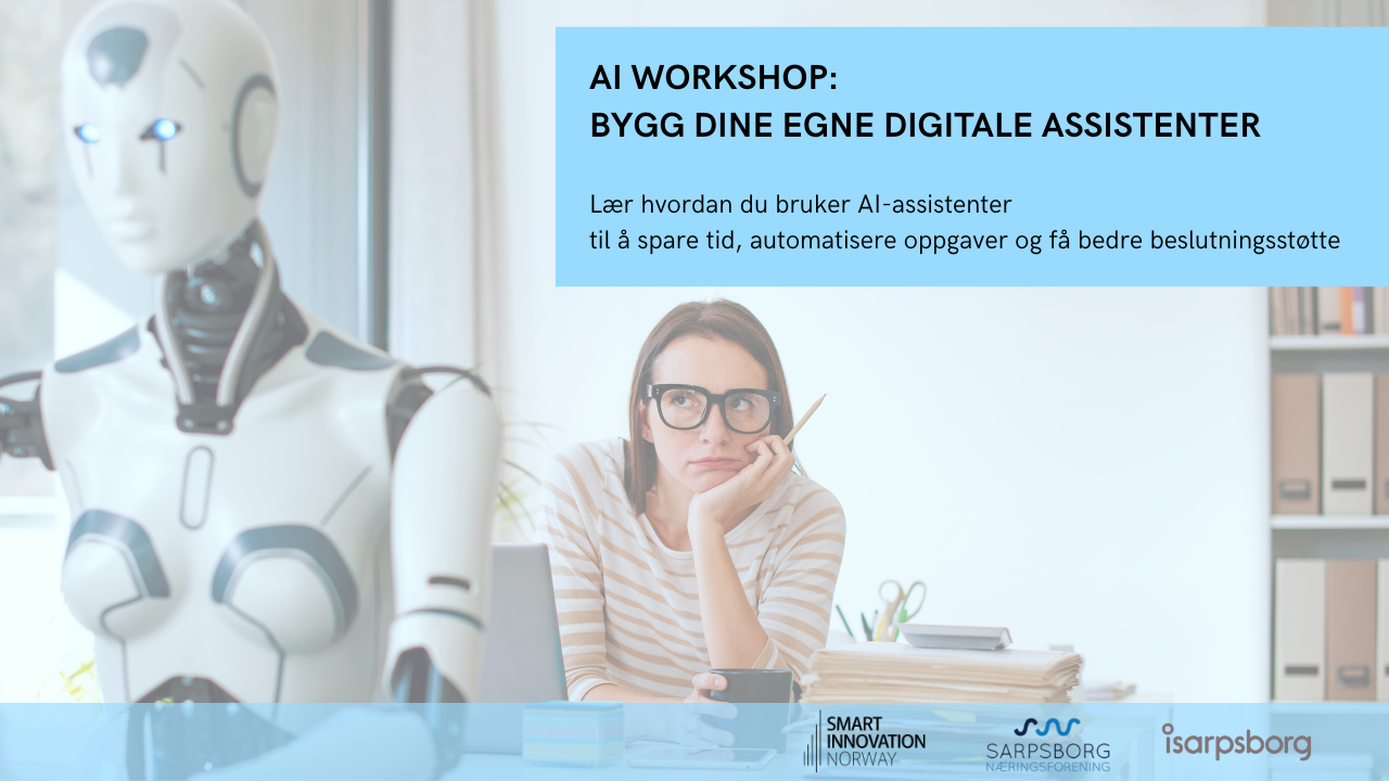 I samarbeid med iSarpsborg og Sarpsborg Næringsforening inviterer Smart Innovation Norway til workshop hvor du lærer å bruke AI-assistenter til å automatisere oppgaver, spare tid og få bedre beslutningsstøtte. Du bygger også din egen assistent som du kan ta i bruk med én gang.